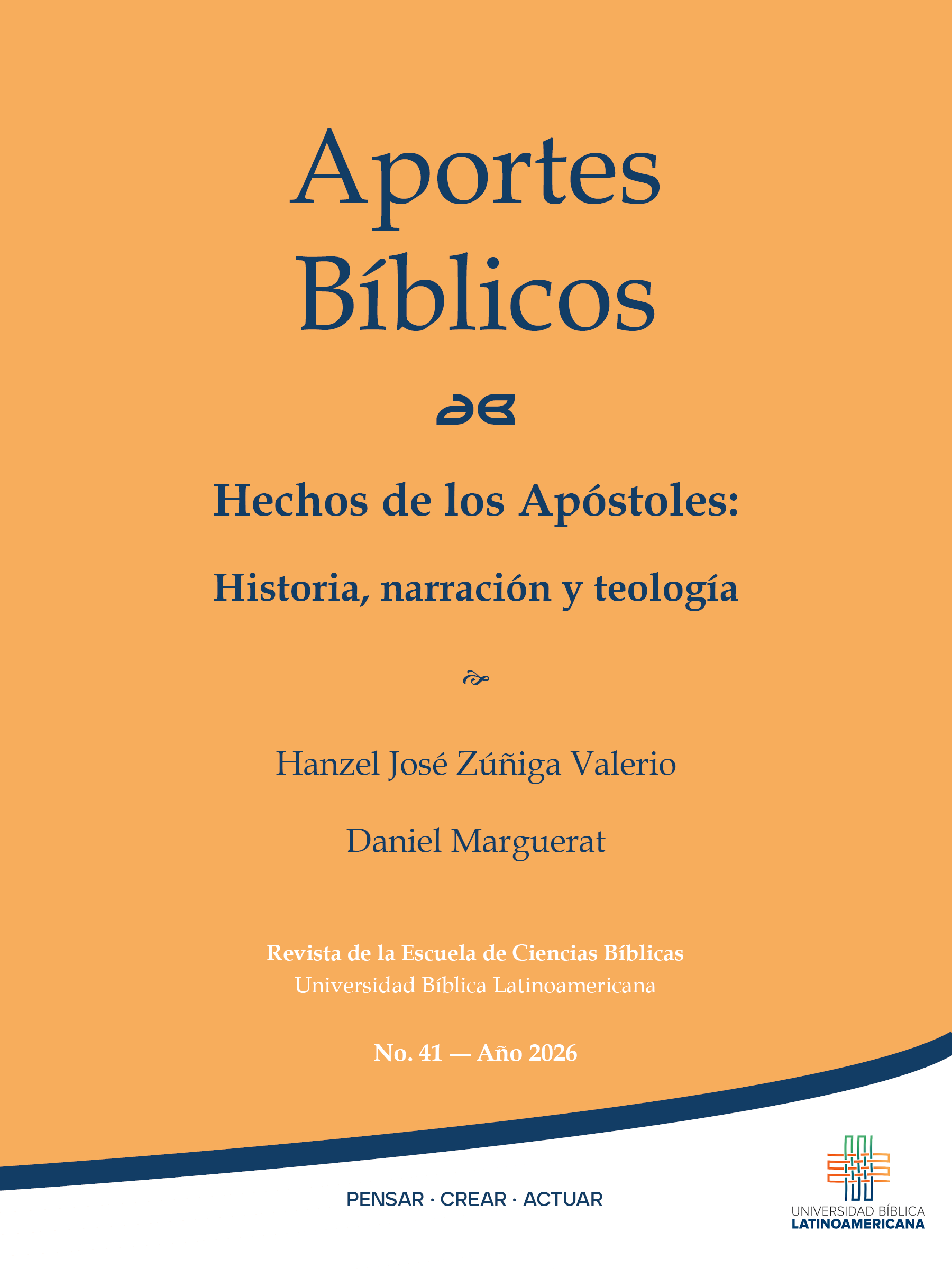 Núm. 41 (2026)Lejos de constituir un simple relato de los comienzos cristianos, como lo evidencian los artículos reunidos en este número de Aportes Bíblicos, en el libro de los Hechos de los Apóstoles confluyen memoria, teología, historiografía y procesos de construcción identitaria. En este número los autores Hanzel Zúñiga y Daniel Marguerat ofrecen aproximaciones rigurosas y complementarias a esta obra, destacando su función como teología de la historia: no la historia de la Iglesia entendida como institución, sino la historia como fruto de la acción de la Palabra y como movimiento impulsado por ella.